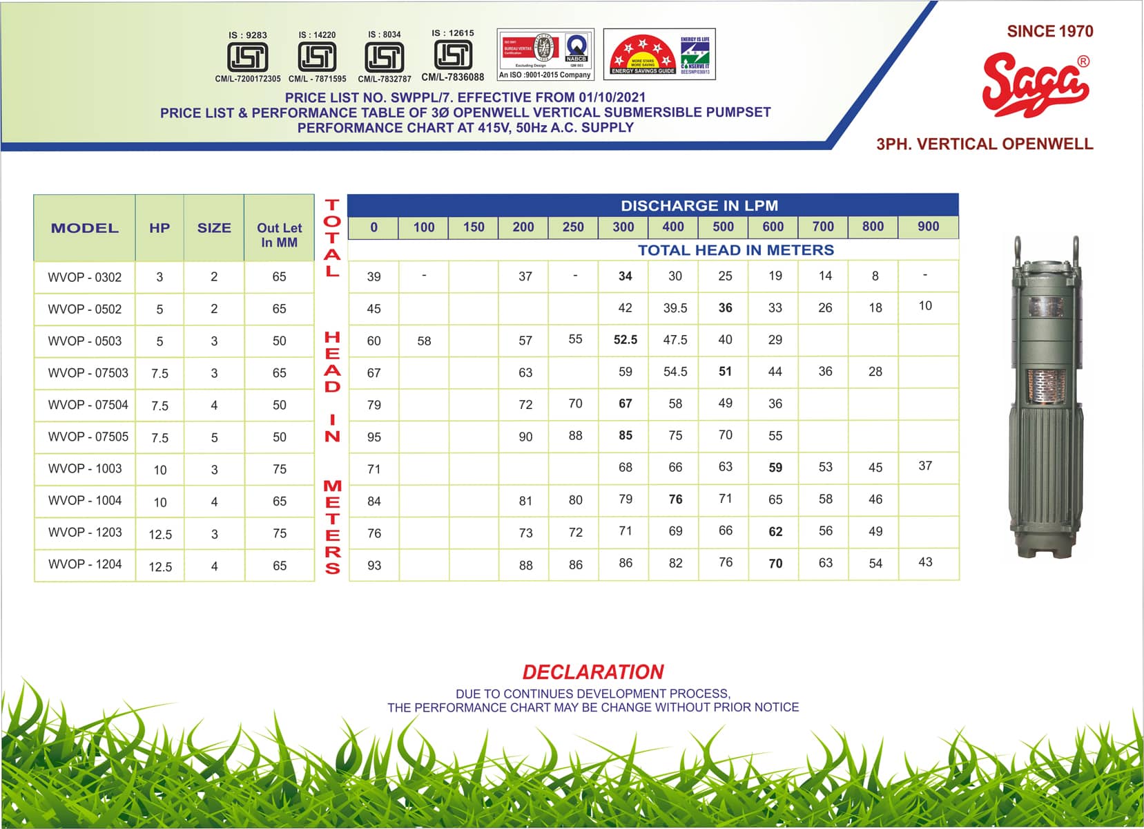 MODEL | HP | SIZE | Out Let In MM | T O T A L H E A D I N M E T E R S |