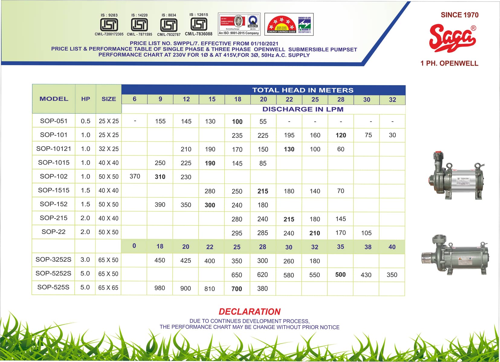 MODEL | HP | SIZE | Out Let In MM | T O T A L H E A D I N M E T E R S |